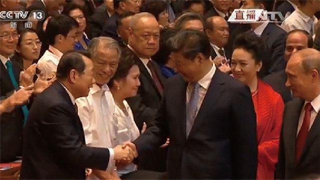 9月3日晚,習近平、李克強等黨和***,與謝國民董事長(cháng)等6000名中外人士在北京人民大會(huì )堂共同觀(guān)看紀念中國人民抗日戰爭暨世界反法西斯戰爭勝利70周年文藝晚會(huì )《勝利與和平》。期間,習近平主席和謝國民董事長(cháng)親切握手。